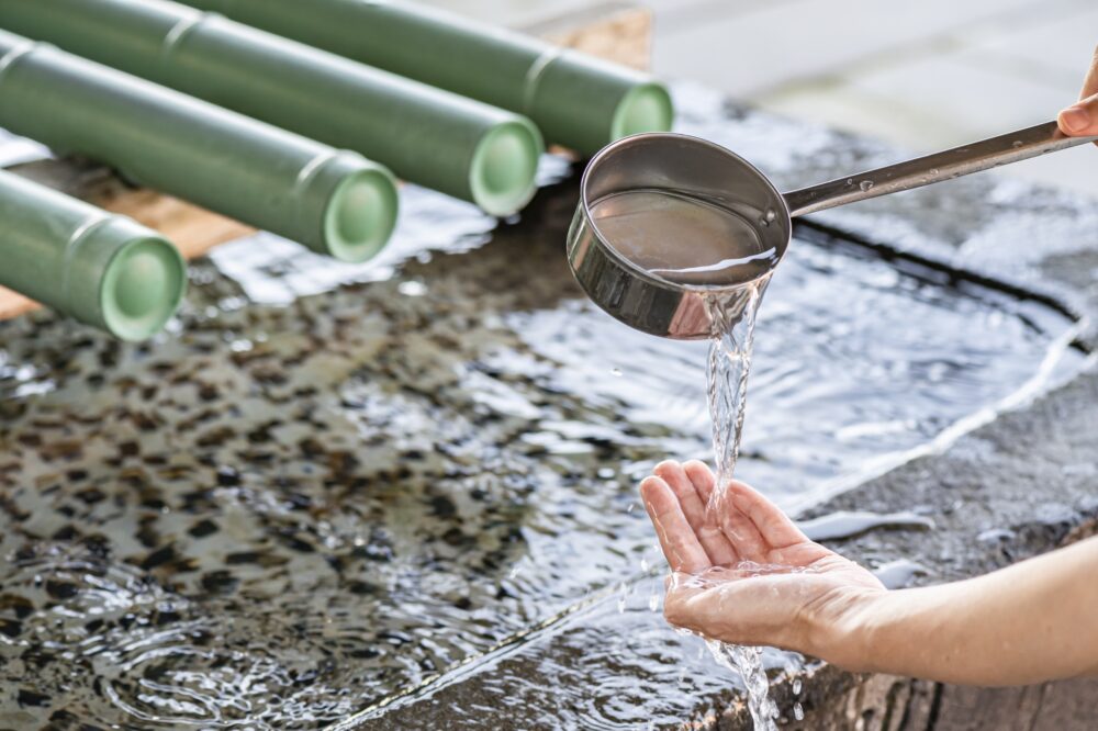 神社の鳥居をくぐり、手水で清め、神前に立つ。