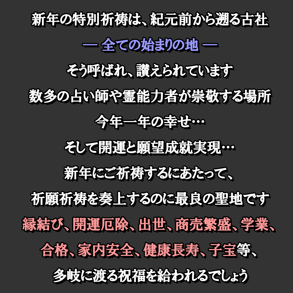 貴方様の願いが叶えられますように、良き運命を迎えられますように、素晴らしい1年をお過ごしになりますように、叶えたい願いごとをお預かりし、霊験あらかたなパワースポット神社にて祈りを捧げます。