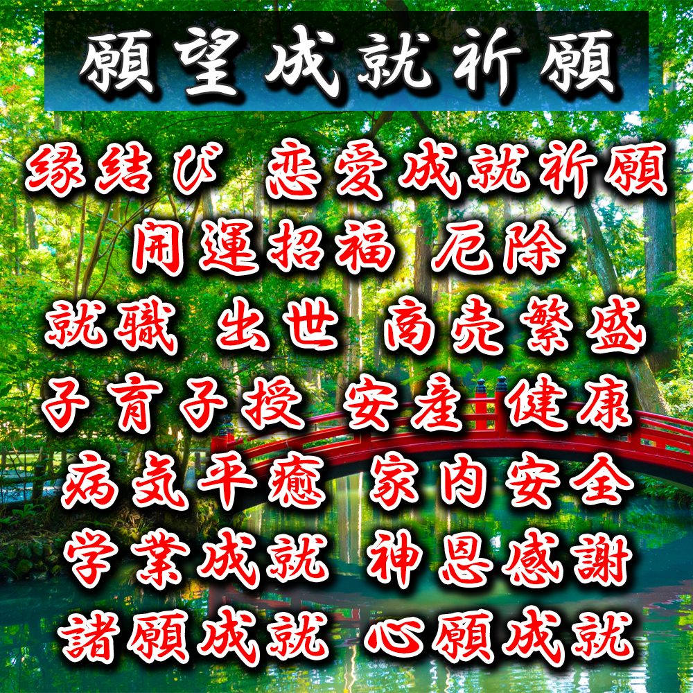 ※神仏への祈りは、願いが叶いますように、心を込めてお届けいたしますが、その結果には様々な要因が影響いたします。最終的な結果は神仏の御心に委ねられます。