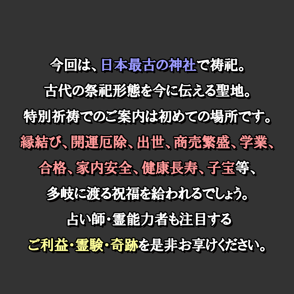今回の天赦日祈祷は、日本最古の神社として崇敬されるパワースポットで執り行います。